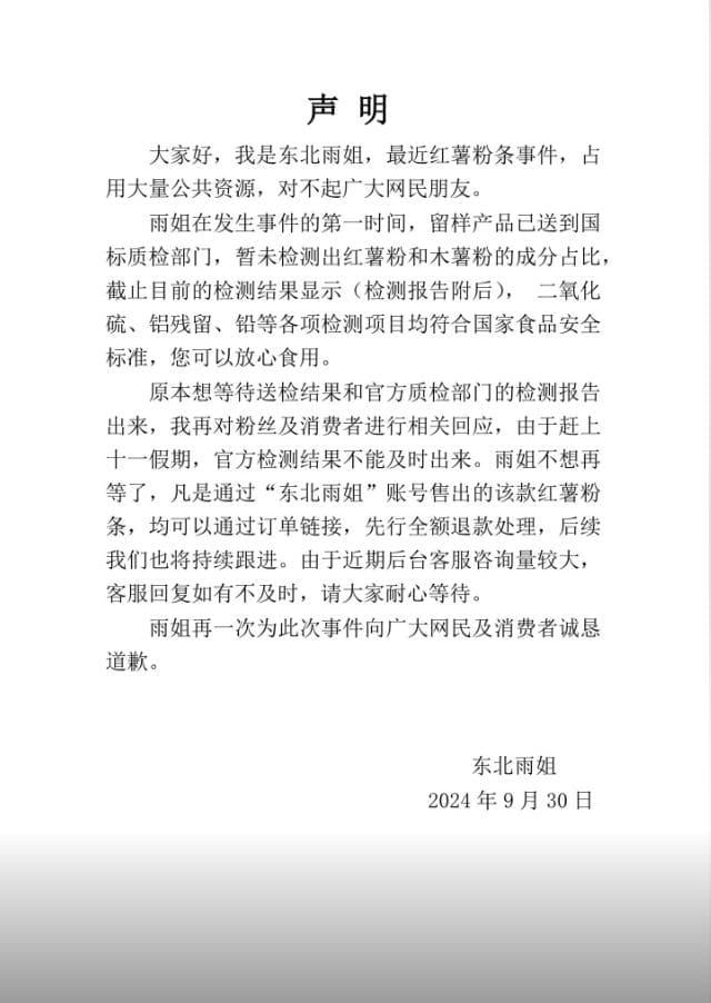9月30日晚,雨姐发布致歉声明,称红薯粉条留样产品已送到国标质检部门,暂未检测出红薯粉和木薯粉的成分占比,但二氧化硫等项目符合安全标准,将先行退款。
