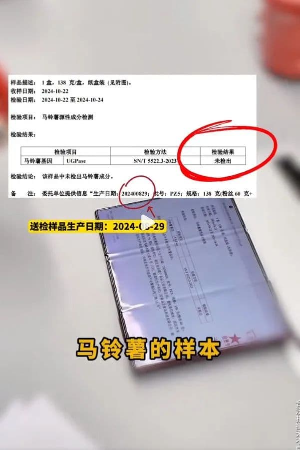涉事红薯粉条品牌负责人也发布声明,表示不认可王海方的检测报告,因为他们在9月也请了另一家机构检测,报告显示只检到红薯成分。