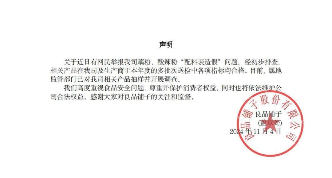 第二天,良品铺子发布声明,表示相关产品在公司及生产商于本年度的多批次送检中各项指标均合格。目前,属地监管部门已对公司相关产品抽样并开展调查。