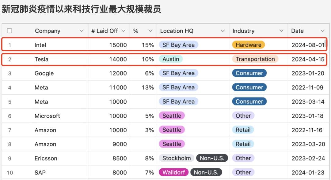 根据Layoffs.fyi对近三年科技公司裁员情况的统计,英特尔今年8月的裁员人数位居近三年来所有科技公司裁员数第一;而紧跟其后的是特斯拉在今年4月裁员14000人,位居第二。