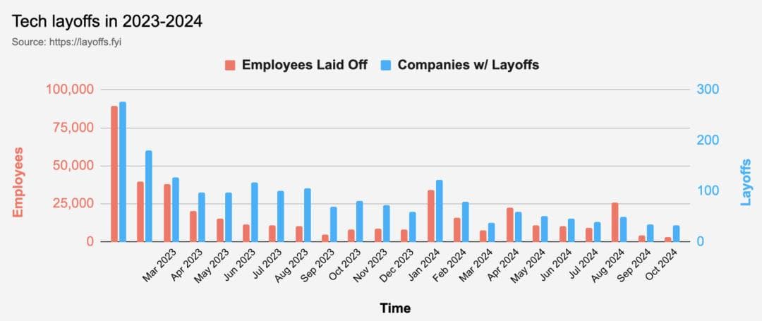 根据Layoffs.fyi数据,2022年大约1064家科技公司进行了裁员,裁员总数达到165269人;2023年大约1193家科技公司进行了裁员,裁员总数达到264220人;2024年(截至10月29日),全球约479家科技公司公布了裁员情况,累计裁员达141467人。