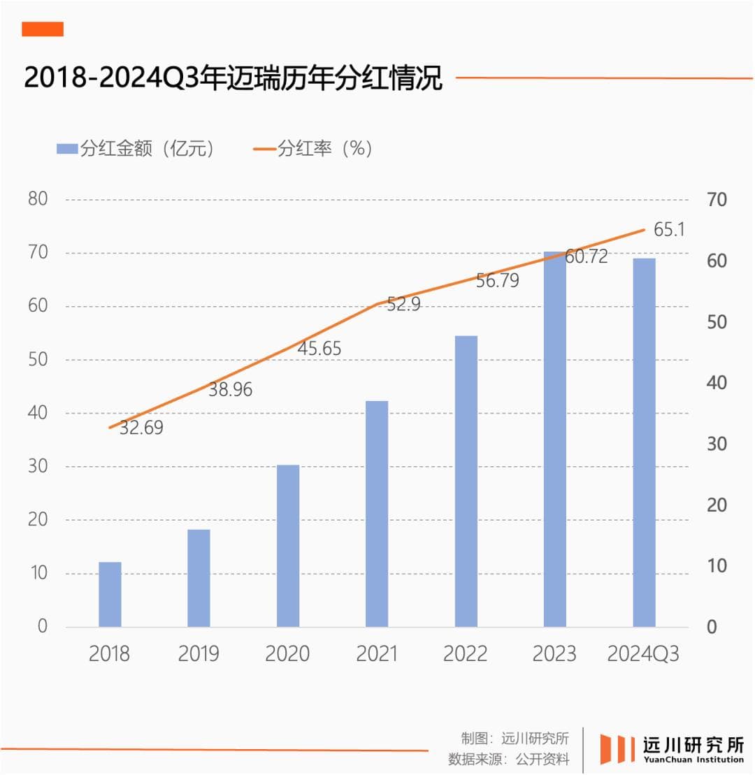 继中报大手笔分红后,迈瑞医疗在三季报继续宣布了面向全体股东的大额分红——共计20亿元,合每10股派息16.5元,2024年两次中期分红比例达到了65.1%。