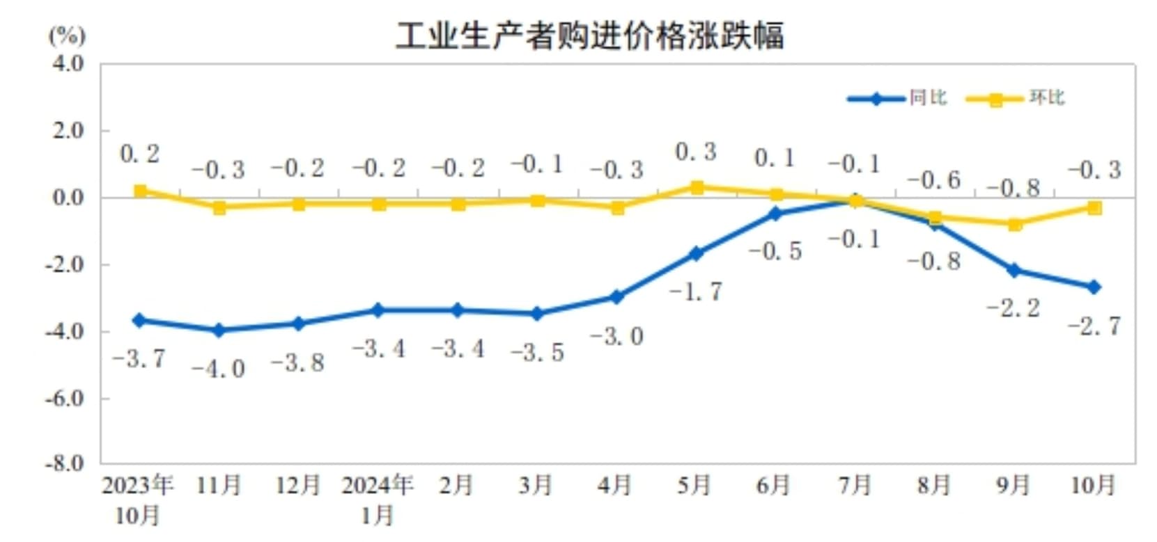 2024年10月份,全国工业生产者出厂价格同比下降2.9%,工业生产者购进价格同比下降2.7%。工业生产者出厂价格环比下降0.1%,工业生产者购进价格环比下降0.3%,降幅均比上月收窄0.5个百分点。1—10月平均,工业生产者出厂价格和购进价格均比上年同期下降2.1%。
