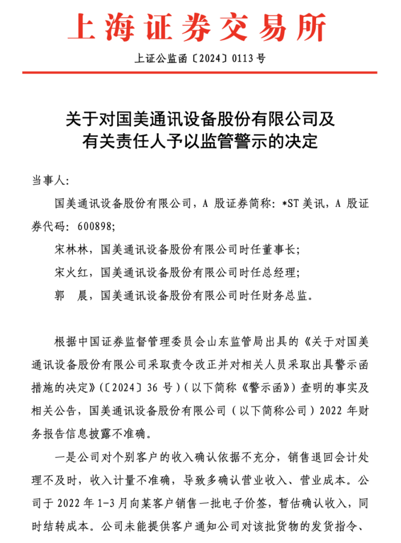 此外,上交所于今年5月14日对公司及宋林林、宋火红、郭晨还予以了监管警示措施。公司及相关责任人、保荐机构及保荐代表人等一系列的处罚书相继落地,加强上市公司全链条监管,强化监管问责的指导思想被一以贯之。