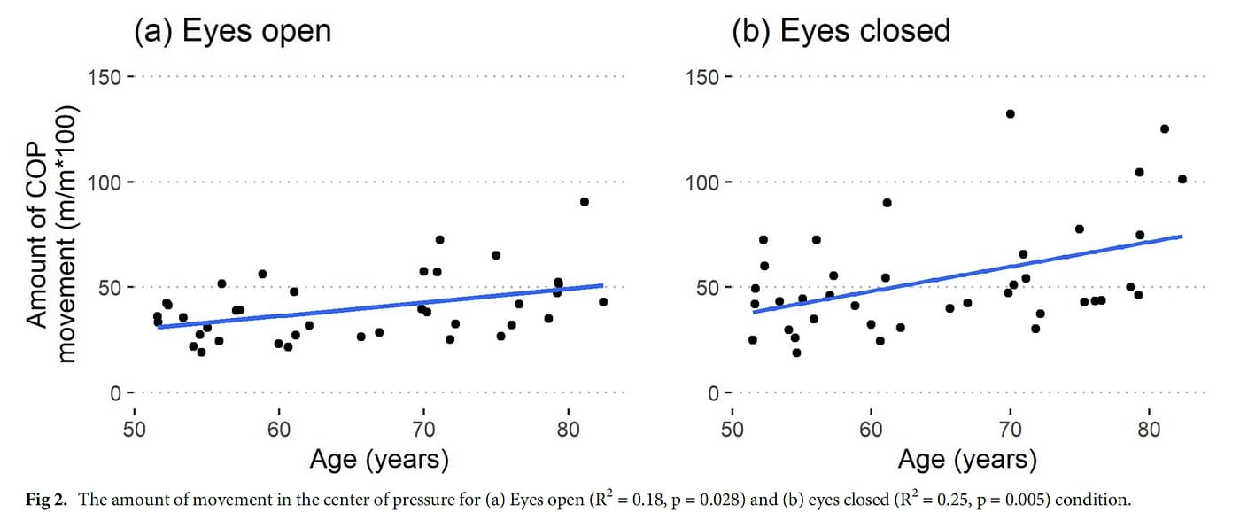 平衡能力的测试中,参与者站在压力板上,睁眼和闭眼分别站立。结果显示,年龄越大,身体晃动越明显,闭眼比睁眼更明显。