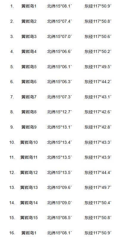 黄岩岛的领海基线为下列各相邻基点之间的直线连线: