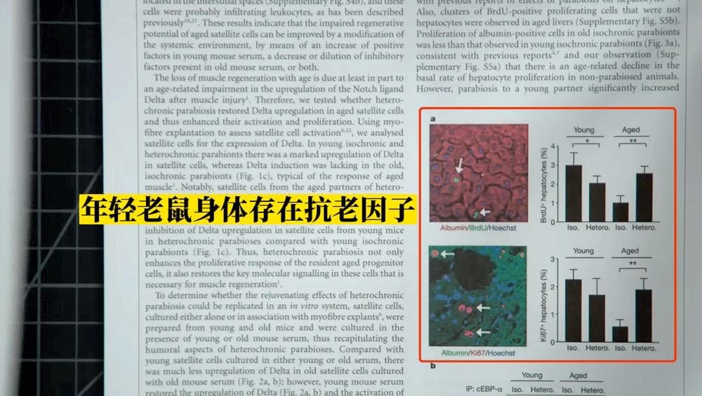 紧接着麦凯又做了另一个让人瞠目结舌的实验。称为Parabiosis共生实验。麦凯找来两只老鼠,一只老的,一只年轻的,通过手术的方法将两只老鼠臀部的血管系统连在一起,形成共享血液循环的状态。结果发现,年老的老鼠在共享了年轻老鼠的血液后,健康情况明显变好。年老的老鼠寿命增长了15%,这说明在年轻老鼠的血液里,存在着一种抗老化的因子。