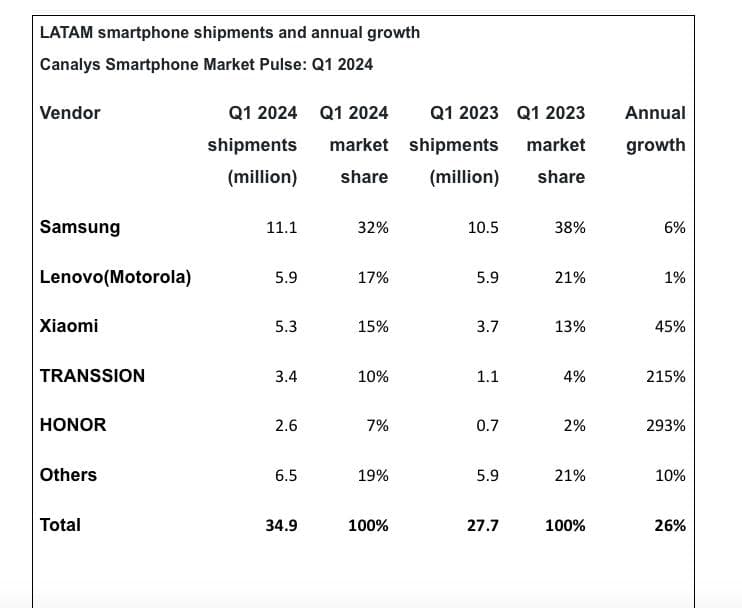 2024年一季度,拉美手机市占率前五席中,除三星占据榜首外,2-5席依次是摩托罗拉、小米、传音、荣耀。