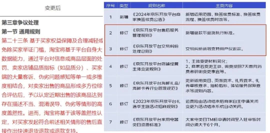 两大巨头都在不同程度地向拼多多看齐。它们开始向中小商家倾斜,加速收编产业带供给;另一个标志性事件是“仅退款”服务的普及,2023年年底,两大平台几乎同时宣布修改售后规则。