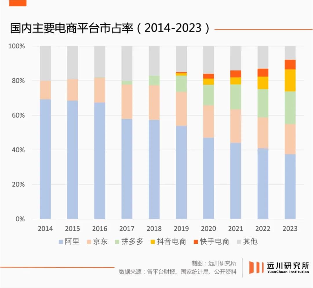 而在2020年至2024年间,阿里与京东的合计市占率下滑超过20%。昔日的电商双雄不得不接受一个残酷的事实:它们所熟悉的版本环境早已挥手自兹去。