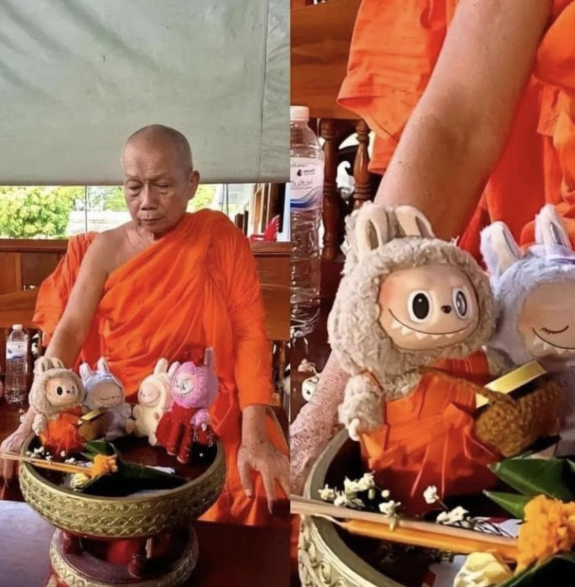 庙里摆着Labubu,僧人们的袋子上也挂着Labubu。