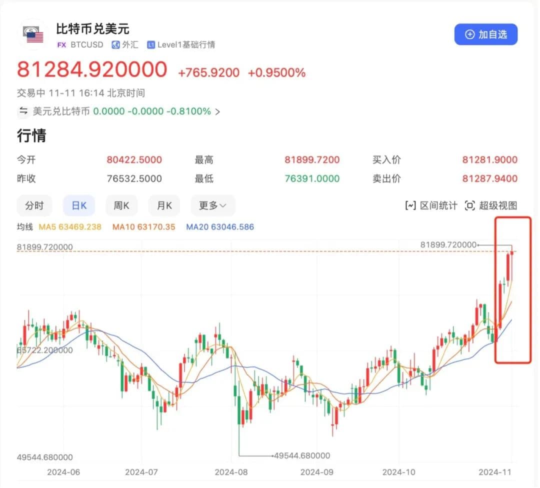 受特朗普大选获胜提振,比特币一路高更猛进,在突破8万美元大关创下历史新高后,继续高歌猛进。