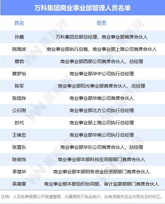 继年初宣布成立商业事业部合并原七大区域商业业务和印力集团后,万科继续深化商业事业部组织建设:设置职能部门和成立专项工作组,明确孙嘉为商业事业部首席合伙人,姚海波升任商业事业部执行总裁、上海公司首席合伙人。