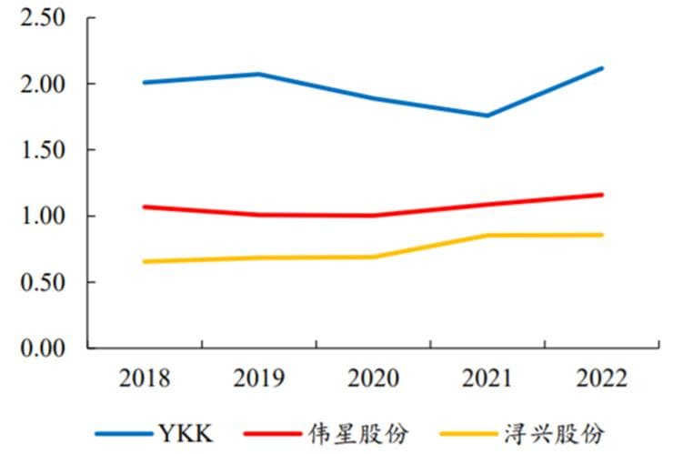 相对于海外同行,伟星股份重要武器之一便是性价比。2022年,YKK拉链平均销售价格为2.1元/条,而伟星股份仅为1.2元/条,前者是后者的1.8倍。
