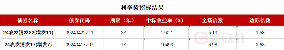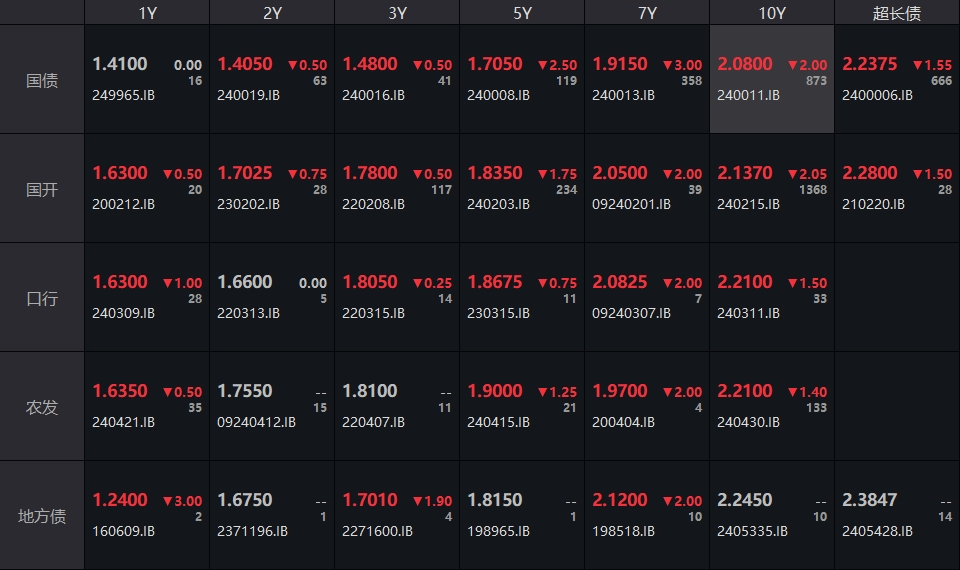 银行间主要利率债收益率多数下行,截至下午16:30,10年期国债活跃券240011收益率下行2bp报2.08%,30年期国债活跃券2400006收益率下行1.55bp报2.2375%,10年期国开活跃券240215收益率下行2.05bp报2.137%。