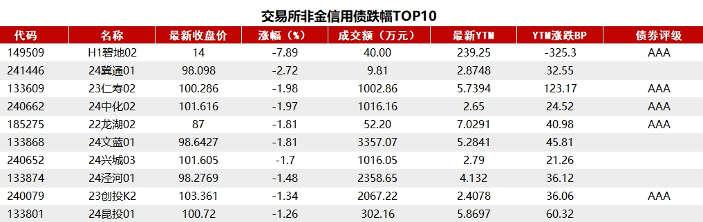 据Choice 数据统计显示,今日交易所市场非金信用债跌幅排行前五的分别是:H1碧地02、24冀通01、23仁寿02、24中化02、22龙湖02。具体如下: