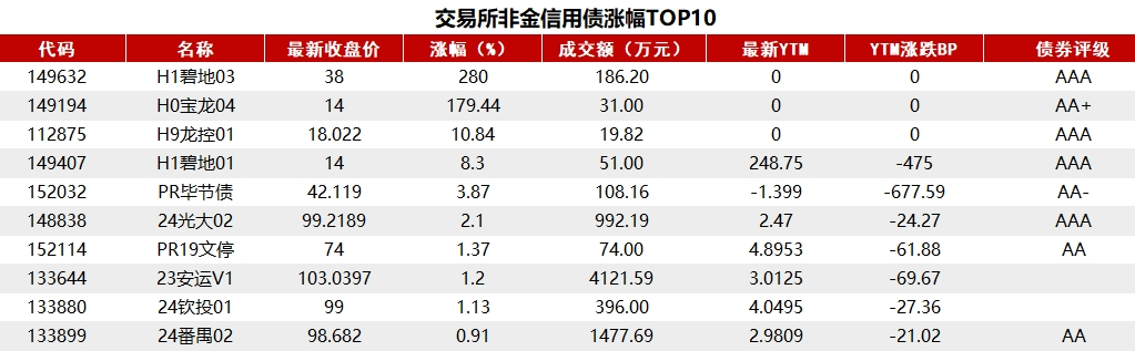 据Choice 数据统计显示,今日交易所市场非金信用债涨幅排行前五的分别是:H1碧地03、H0宝龙04、H9龙控01、H1碧地01、PR毕节债。具体如下:
