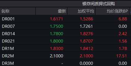 银行间市场回购定盘利率多数上行,FR001报1.7200%,较上日涨2.00个基点;FR007报1.9000%,较上日涨2.00个基点;FR014报1.9200%,较上日涨2.00个基点。