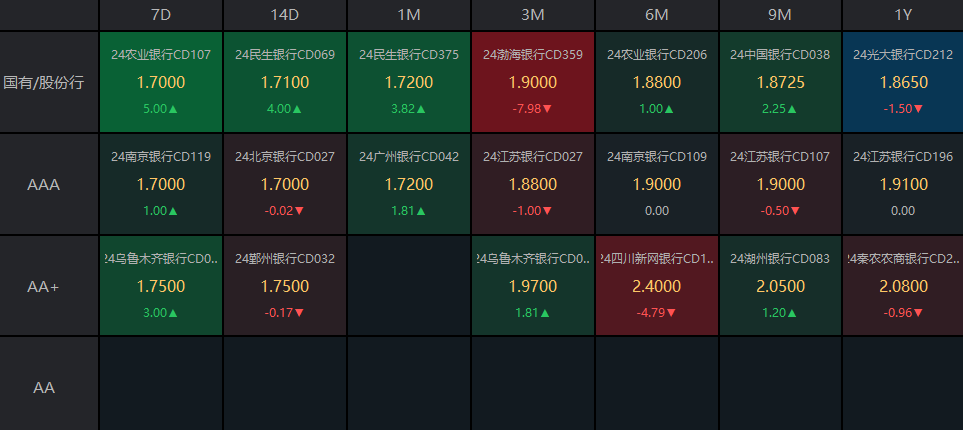 存单方面,今日3M期国股在1.68%-1.9%位置需求较好,较前一日下行3bp,1Y期国股报在1.86%-1.95%的位置,较前一日下行1.5bp。AAA级存单方面,9M成交在1.9%,1Y成交在1.91%的位置。
