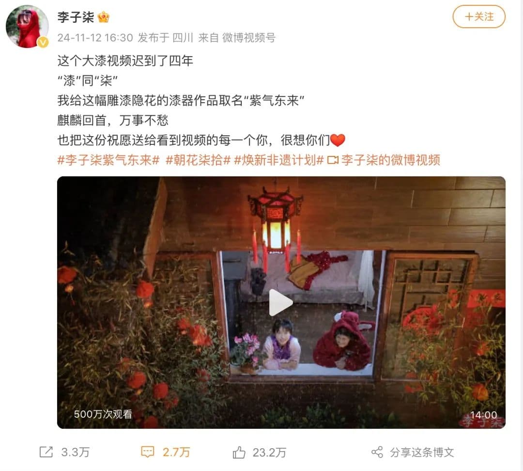 基于这些因素,她的形象进一步被视为中国传统文化的代表符号之一,人们对她的认知不再仅仅局限于一个网红,而是一个具有深厚文化内涵和影响力的人物象征。而这几年,李子柒的每一次公开亮相,几乎都和文化传承、创新、文旅相关。