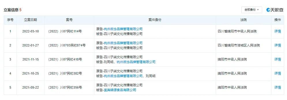 这是双方的首次正式交锋。而在接下来的2021年11月中旬,子柒文化作为原告,状告刘同明和微念的另一则案件也正式立案。微念也很快新增了两条立案日期分别为2022年1月和3月的立案信息,且被告为子柒文化。