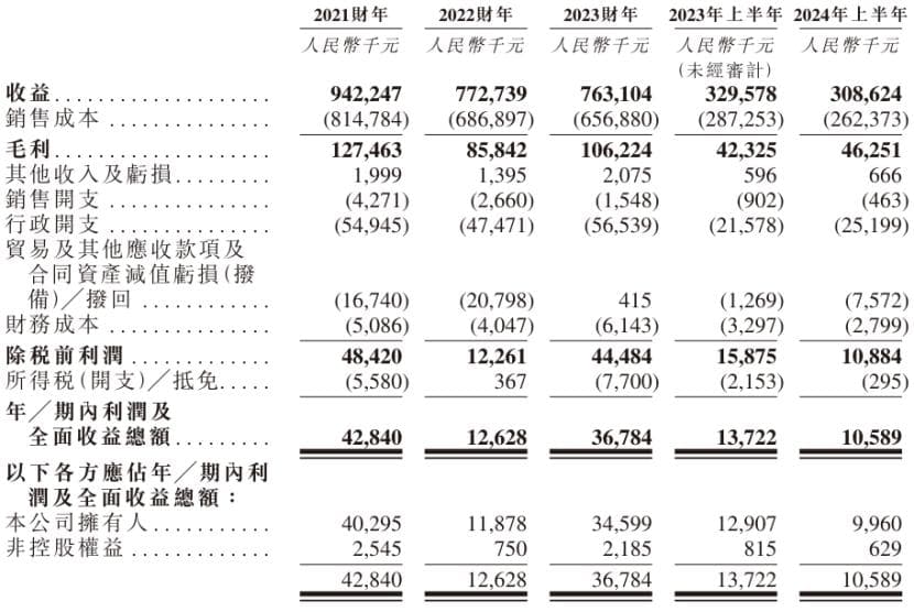 财务数据方面,2021财年、2022财年、2023财年及2024年上半年(简称“报告期”),公司的营收分别为9.42亿元、7.73亿元、7.63亿元和3.09亿元,利润及全面收益总额分别为4284万元、1263万元、3678万元、1059万元,相应期间的毛利率分别约为13.5%、11.1%、13.9%及15.0%。