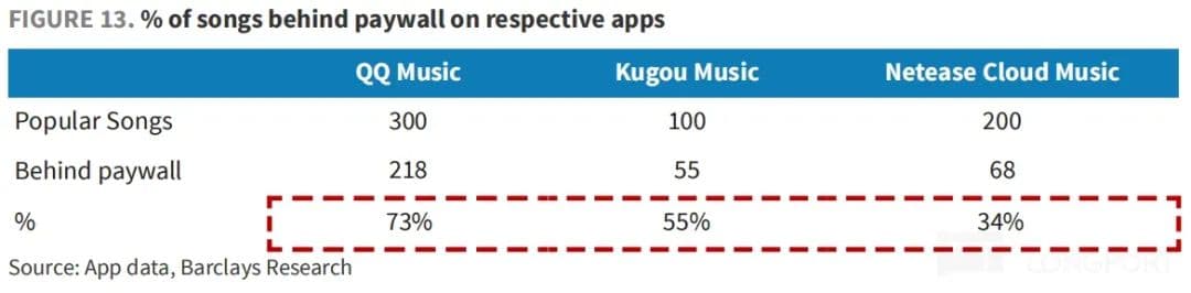 (1)目前腾讯音乐旗下两大音乐平台 QQ 音乐和酷狗音乐,纳入到付费墙的 VIP 曲目占比 50-70%(其中热门曲目 50% 进了付费墙),均显著高于其他同行,比如云音乐约 35%,抖音的汽水音乐就更低了。因此硬拔 “VIP 占比”,对用户使用感受有影响。
