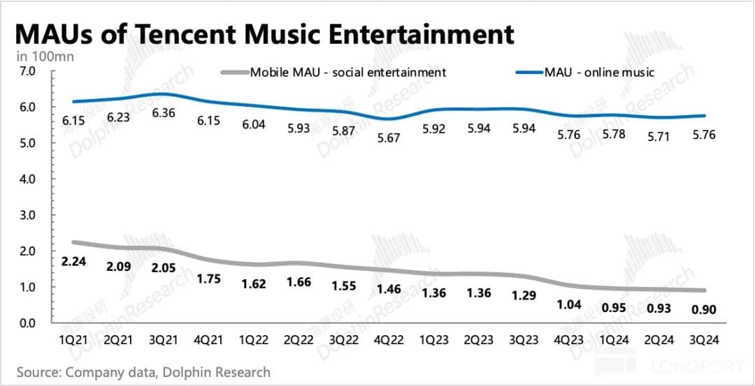 三季度腾讯音乐在线音乐月活环比增加了 500 万至 5.76 亿。直播等社交娱乐还有整改影响,虽然有旺季加持,但社交娱乐月活还是环比下滑了 300 万。