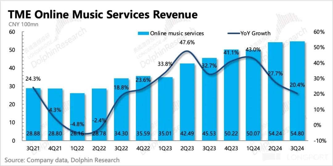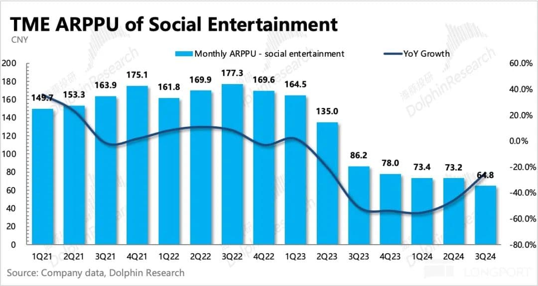北京时间 11 月 13 日港股盘后,腾讯音乐发布了 2024 年第三季度财报。上季度因为短期用户数指引的问题,市场开始质疑腾讯音乐的成长性,尤其是中长期增长如果仅靠拉高人均付费的话,在当下的国内消费环境下的持续性问题。
