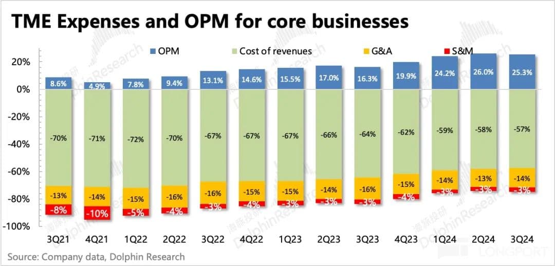 最终毛利率环比进一步提升了 0.6pct 达到 42.6%,虽然提升速度放缓,但上个季度 Spotify 的捆绑套餐玩法,也给了我们一些启发:对于腾讯音乐,市场似乎低估了它能够靠着产业链议价优势,通过 1)重谈协议分成;2)变换前端产品/服务的形式(如捆绑服务),来达到持续优化上游成本或者整体提高毛利率的能力。