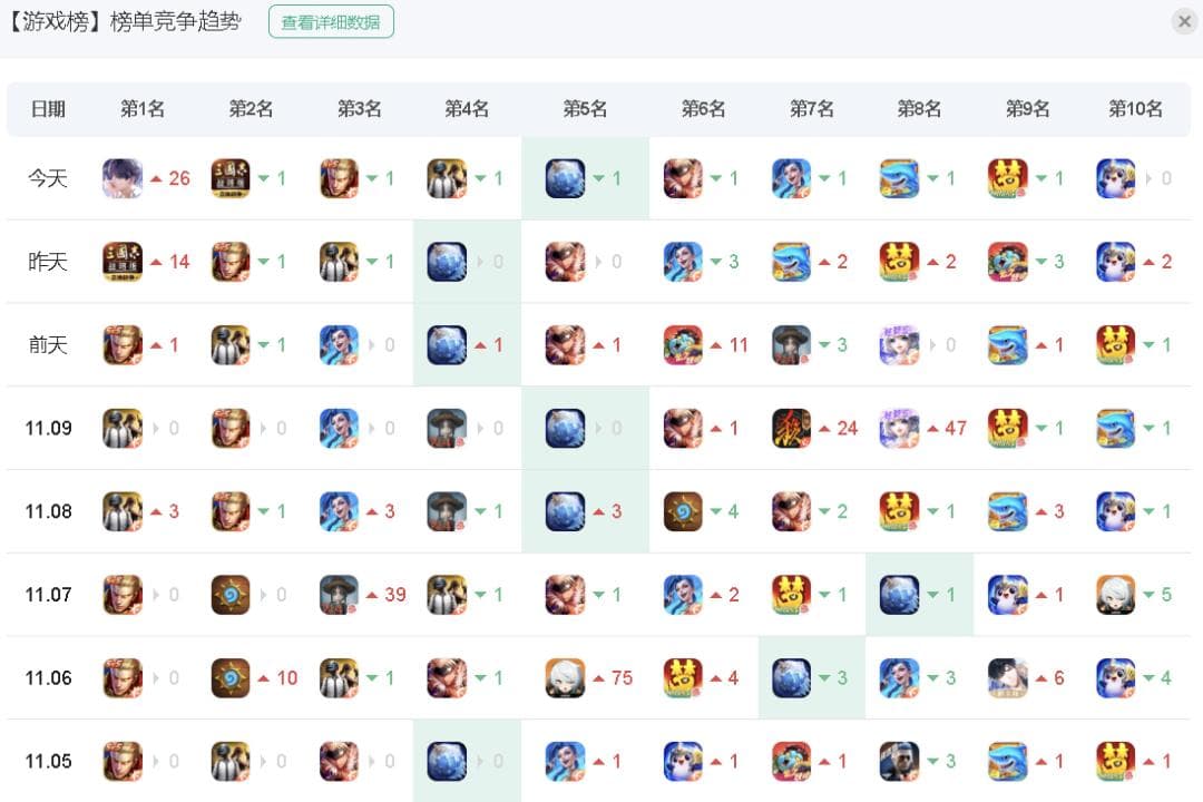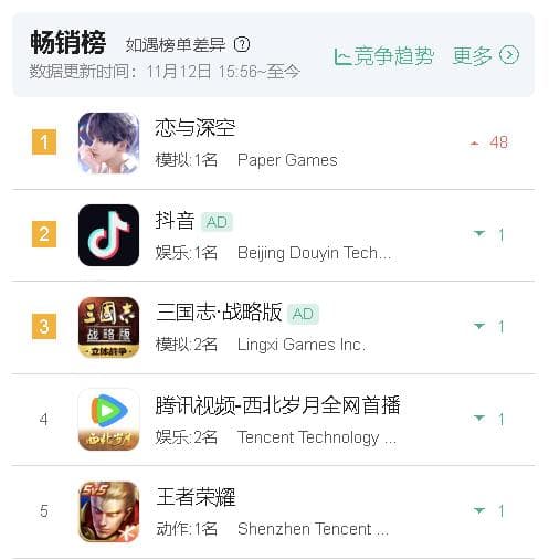 过去几天,游戏产品在畅销榜上的竞争,可以说前所未有地激烈:11月8日《和平精英》冲上游戏畅销榜Top 1后,《王者荣耀》随后在11月10日重回榜首;之后的两天,《三国志·战略版》和《恋与深空》分别又爬升14和26名,占据了第一位。