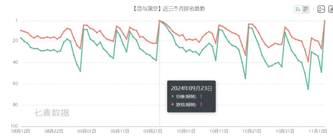 而在今天超越了抖音,升上总畅销榜第一的《恋与深空》,则是自今年1月上线后,第二次拿到这个成绩。此前其最高达到畅销榜Top 2,直到9月23日游戏推出「欲揽旖旎色」国风主题版本,一举冲上了榜一。Sensor Tower数据显示,游戏在当天迎来了上线以来的最高流水,在中国iOS市场的当月收入提升了29%。