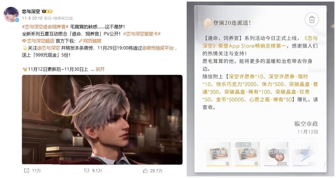 今天冲上榜一,则是因为游戏以男角色的猫化形象为主要卖点,推出了「遵命,饲养官」主题版本。登顶后,游戏内和上次一样,给玩家们发放了每人一些福利。