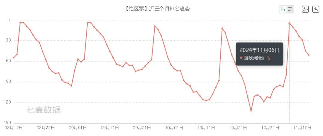 不止这两款登顶的产品,其他不少久违榜单前列的游戏产品,也在最近活跃异常,一度空降Top 5。比如此前在Top 50内波动的《第五人格》,前几天曾在版本更新后“一波翻红”,冲上了游戏畅销榜Top 3;《绝区零》上线新版本后,也稳定地回到了Top 5。