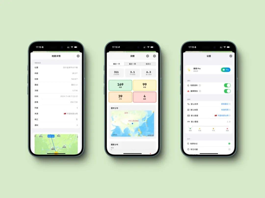 震感 App 详情页面、数据洞察页面、设置页面