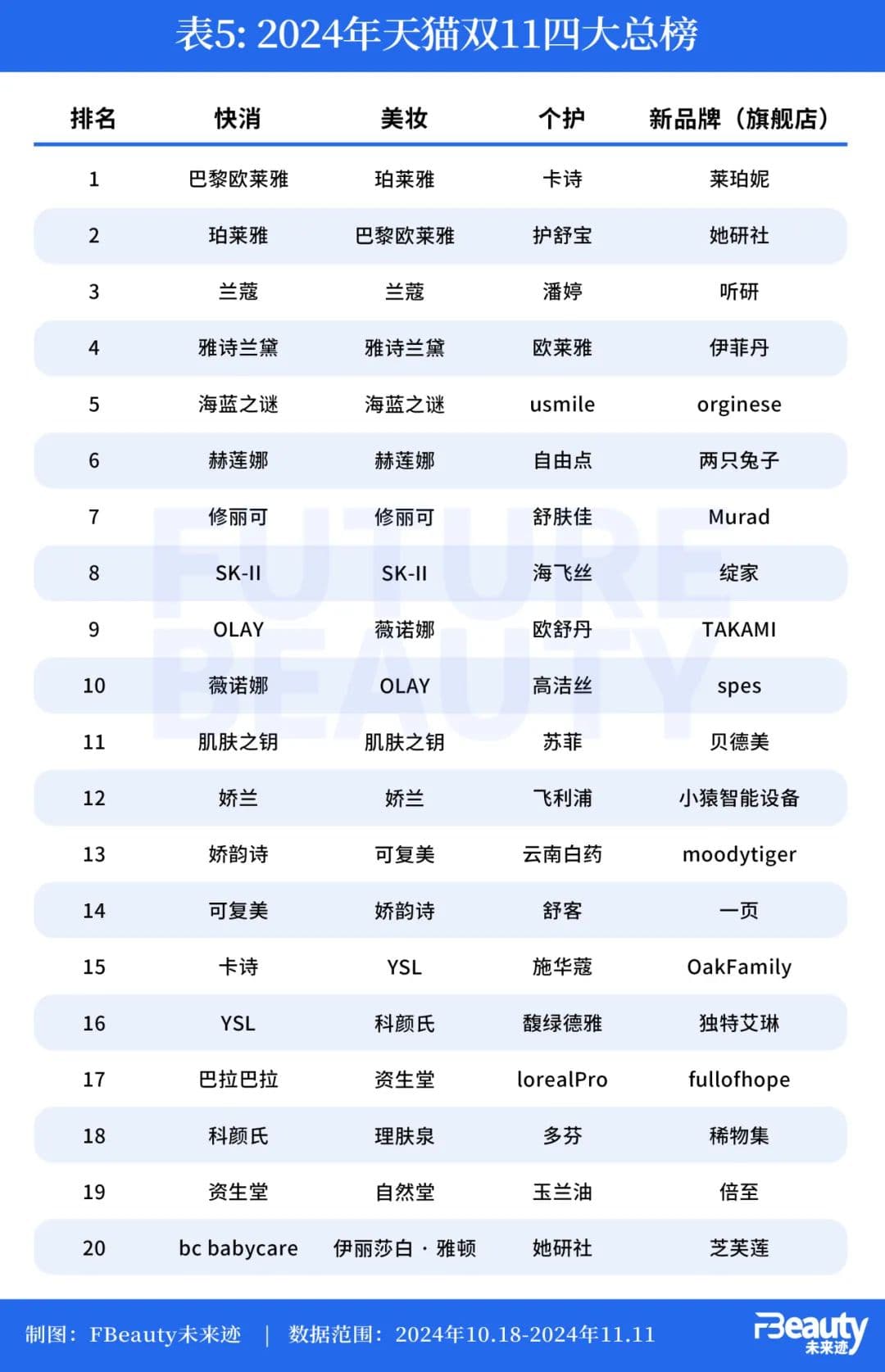 那么,今年双十一各大电商平台究竟表现如何?《FBeauty未来迹》综合全网数据以及天猫、抖音、京东、快手、腾讯视频号五大平台的美妆个护排名梳理出12张表格,让你一次性看懂这个双十一的美妆竞争格局。