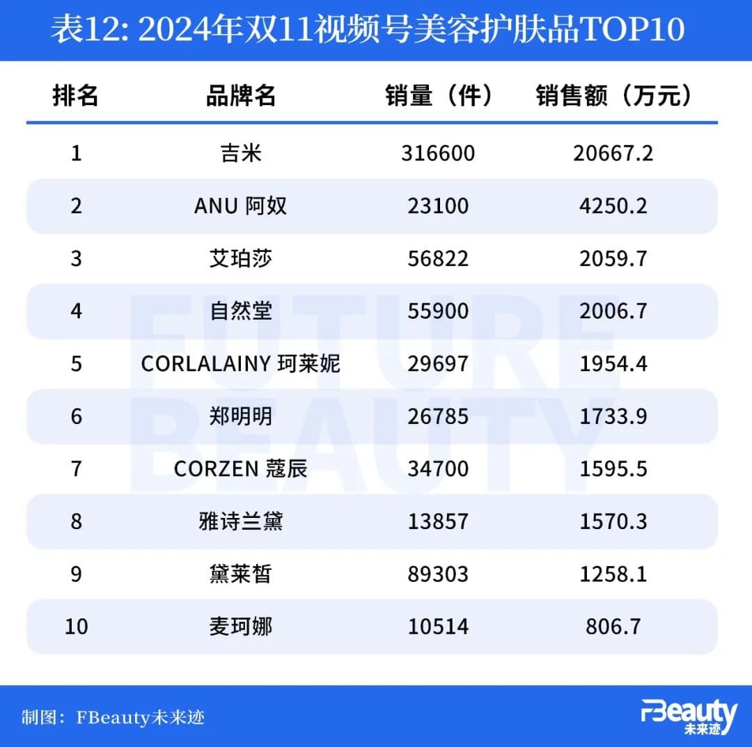 腾讯视频号虽然整个双十一期间美妆类产品销售额只有大约6.5亿元,但也有大牌开始盯上了视频号的潜力,典型的比如雅诗兰黛和自然堂,均在今年双十一Top10排名内。