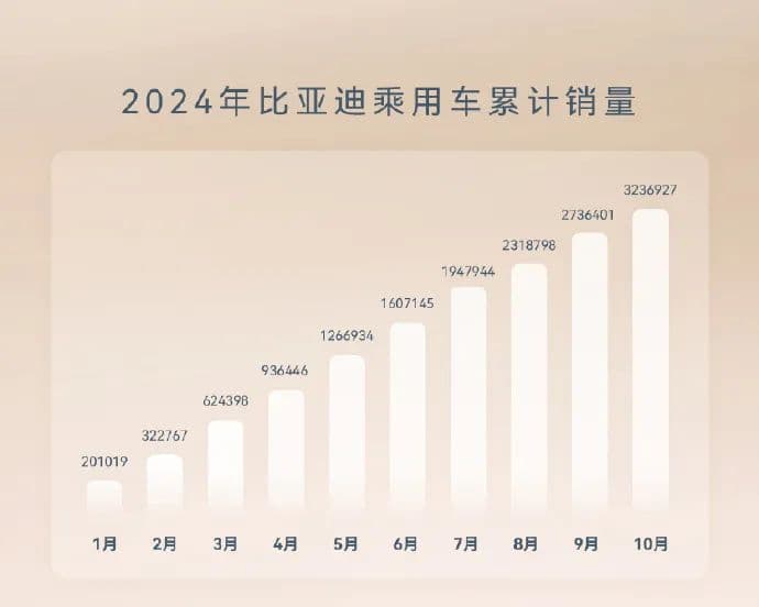 目前,比亚迪多款车型在各细分市场中长期稳居销冠。刚过去的10月,比亚迪销量首次突破了50万辆,突破中国品牌单月销量纪录。今年1-10月,比亚迪销量已达325万辆,同比增长超过36%。