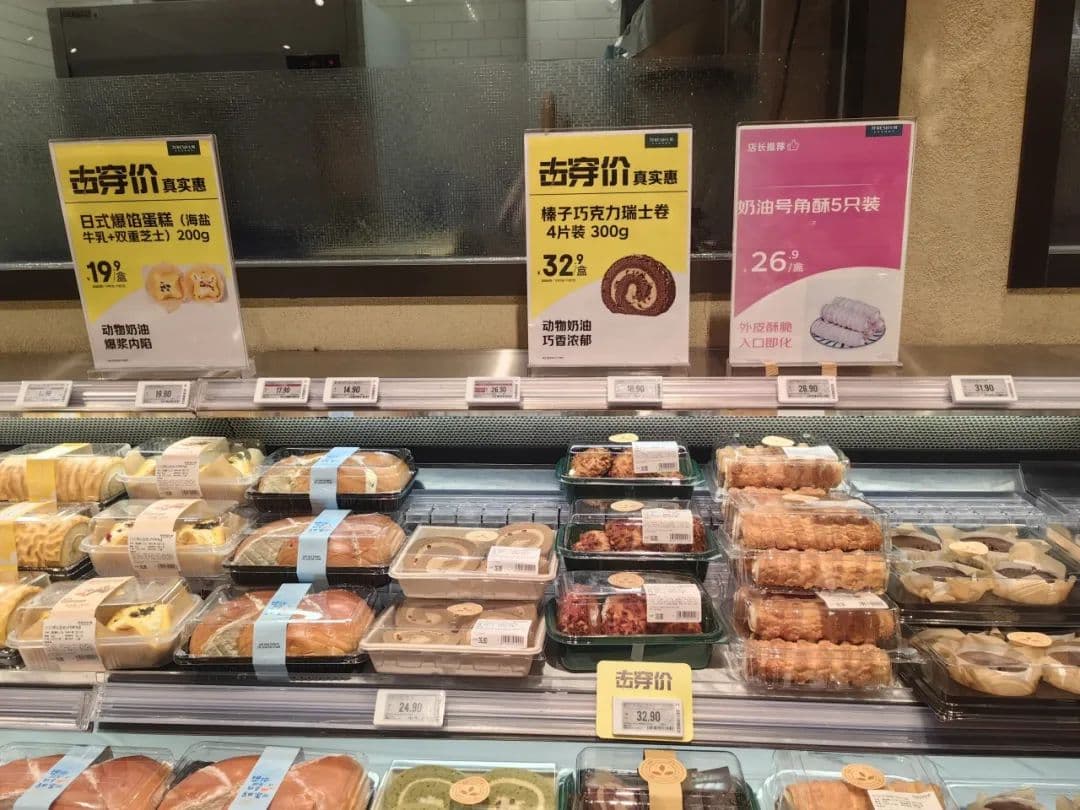 以阳光玫瑰青提为例,记者比对了不同渠道的售价,七鲜超市“击穿价”为24.9元/箱(1.5kg),盒马为39.9元/箱(1.5kg),小象超市为25.9元(750g),山姆为79.9元(2.5kg)。比对下来,七鲜超市最便宜。同类型的四拼口味瑞士卷,京东七鲜也比盒马会员价便宜10元。