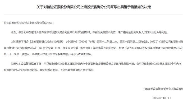 罚单指出。聘请外部专家时,信达证券上海投资咨询分公司与分析师存在违规事项,并均被出具警示函。而就在今年10月底,中证协刚披露的2023年券商发布证券研究报告业务经营情况中,就重申了券商在聘请外部专家时应加以合规管理。