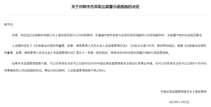 这同样是一次“一案双罚”的情况。罚单显示,经查,信达证券上海投资咨询分公司在邀请外部专家参与证券投资咨询服务以外咨询服务时,存在相关管控不到位,未严格规范有关从业人员的执业行为等问题。此外,韩字杰在信达证券上海投资咨询分公司任职期间,在邀请外部专家参与证券投资咨询服务以外咨询服务时,未能遵守相关执业规范要求。