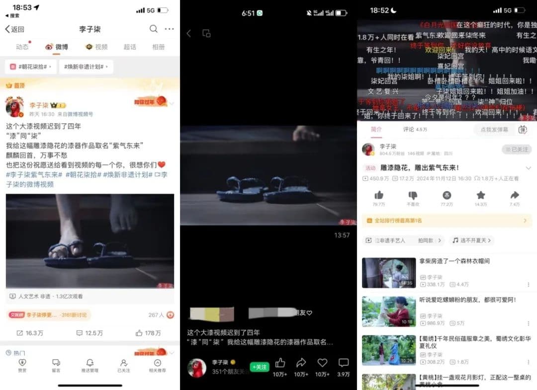 1、视频。“大漆视频”,在微博1.3亿播放量,抖音622万点赞(看不到播放量),B站上的播放量449.5万,视频号3个10万+(点赞、转发、点心)、快手点赞75.1万、小红书点赞43.6万。