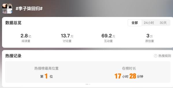 3、话题。#李子柒回归#微博话题量达2.8亿,热搜榜第一,在榜时间17+小时。