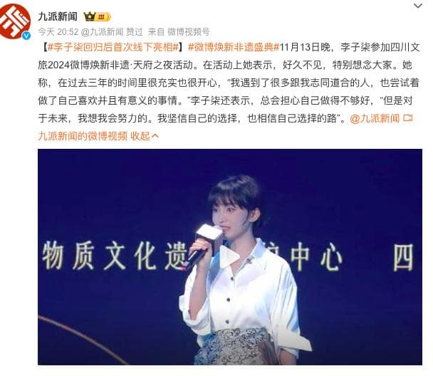 昨天晚上(11月13日),李子柒还出席了四川文旅2024微博焕新非遗·天府之夜活动。这也是她复出之后的首次线下亮相。