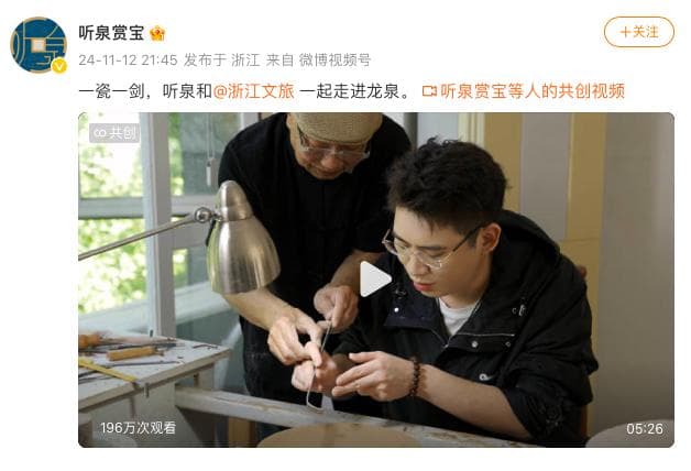 反倒是前段时间在抖音差点“翻车”的@听泉赏宝 ,则马上开通了微博,还与@浙江文旅 做了一次内容共创,追寻非遗技艺。