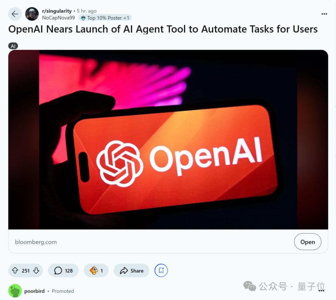 参考链接:[1]https://www.bloomberg.com/news/articles/2024-11-13/openai-nears-launch-of-ai-agents-to-automate-tasks-for-users[2]https://www.reddit.com/r/singularity/comments/1gqn099/openai_nears_launch_of_ai_agent_tool_to_automate/[3]https://x.com/omarsar0/status/1856802883112767541