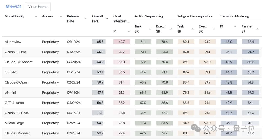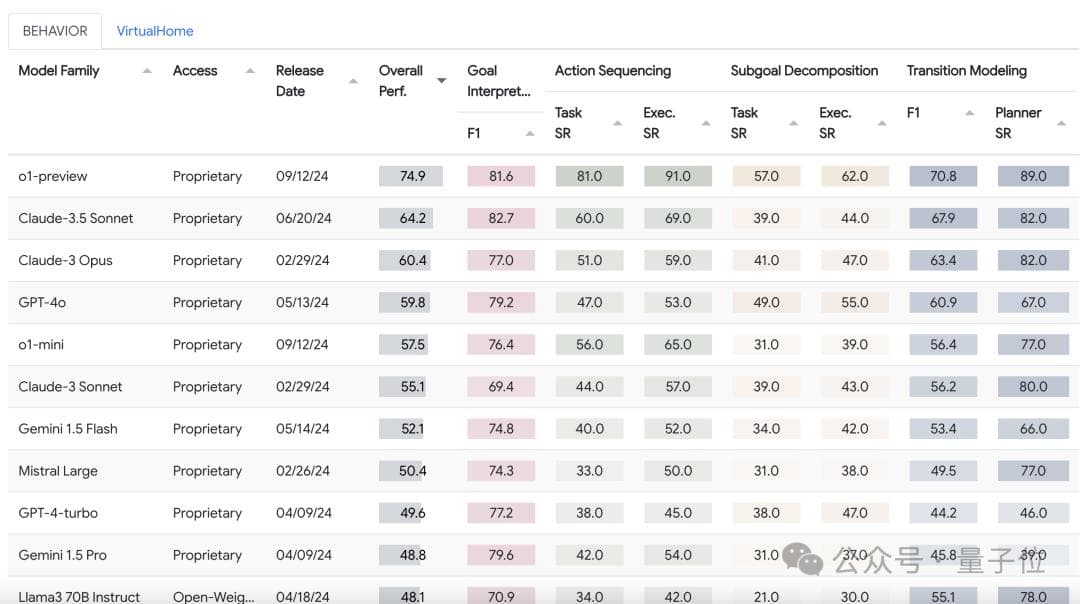 在BEHAVIOR和VirtualHome环境下,o1-preview均获得了排行榜综合成绩第一名。