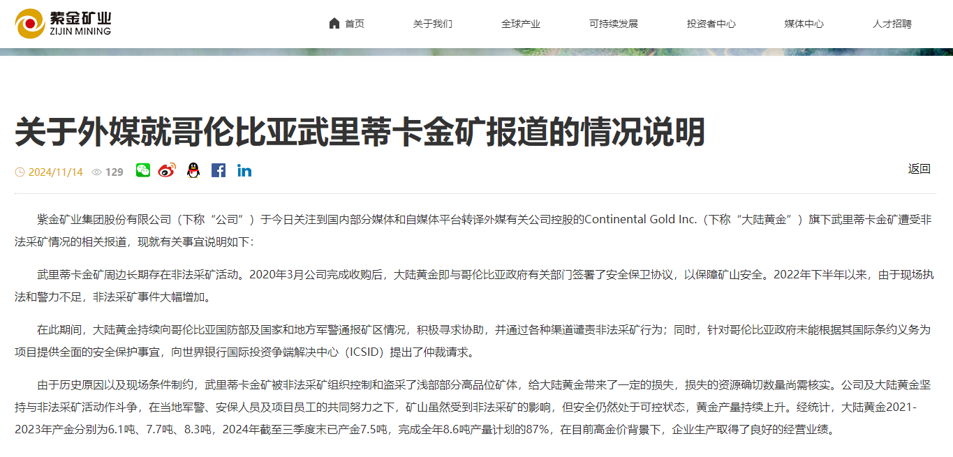紫金矿业回应哥伦比亚武里蒂卡金矿遭非法采矿:损失资源确切数量尚需核实,矿山安全仍处于可控状态
