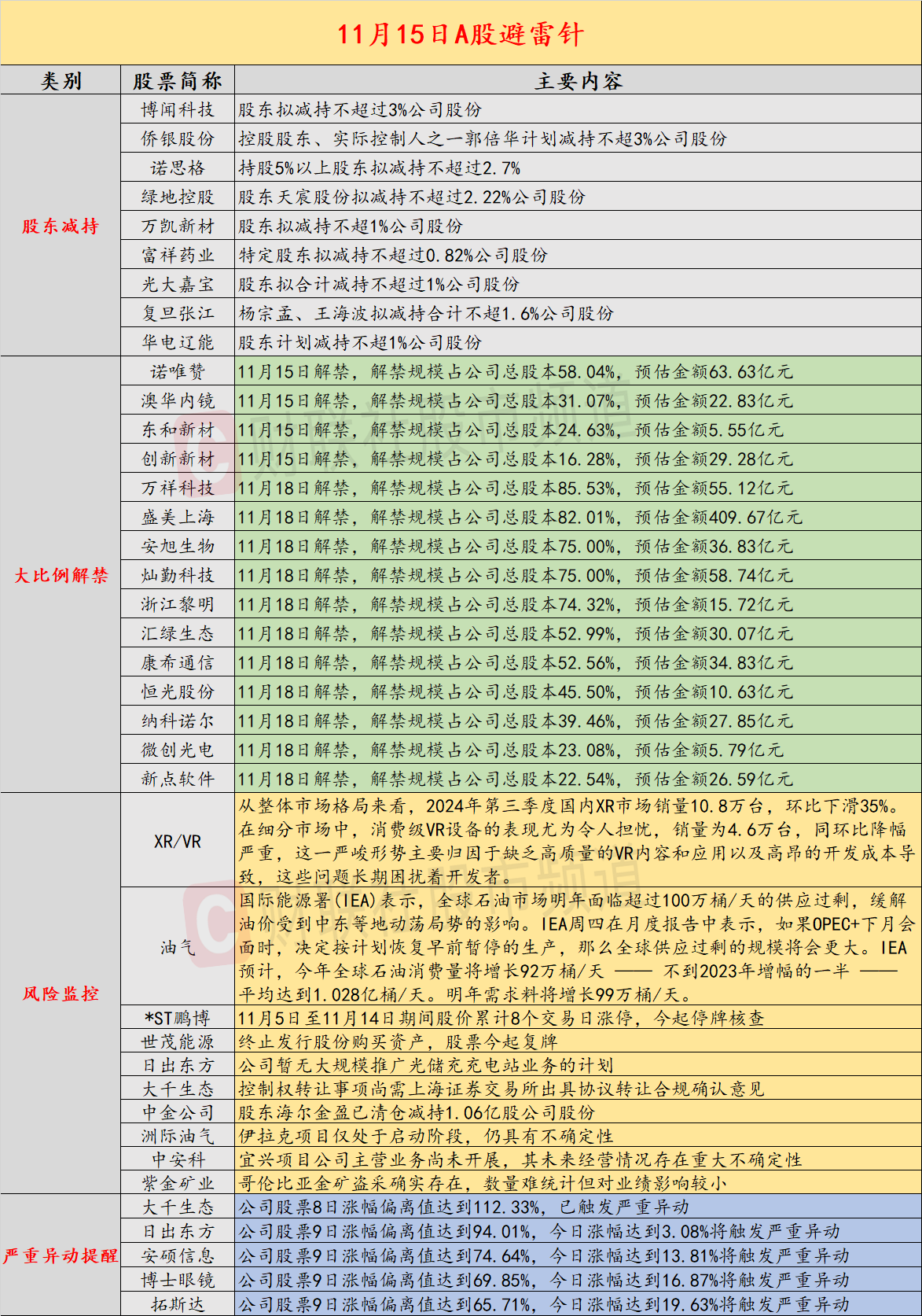 11月15日投资避雷针:连续8个交易日涨停 这只股票今日起停牌核查