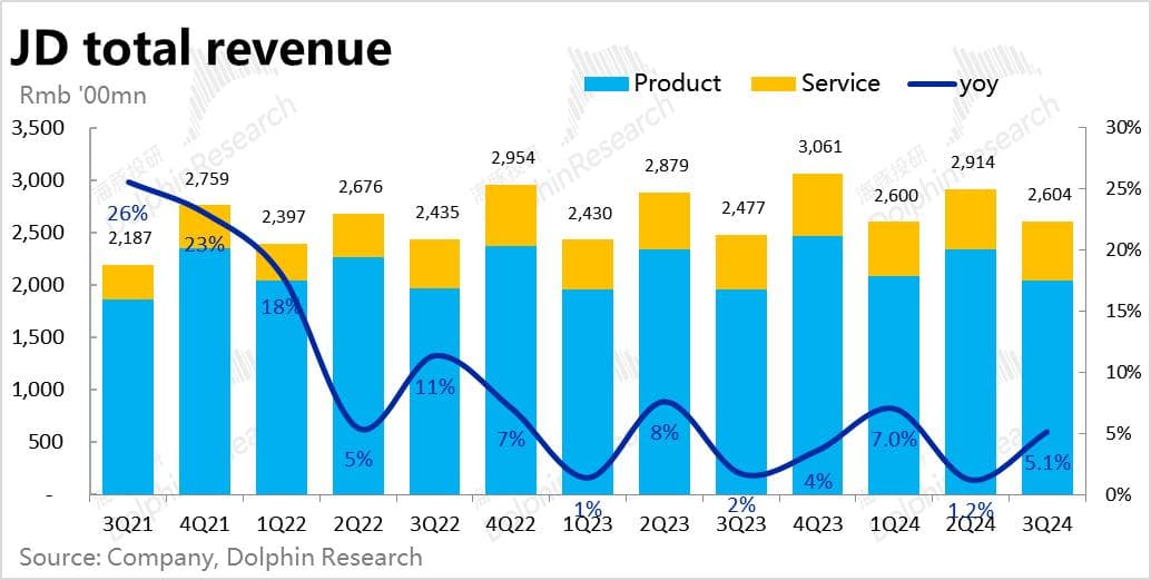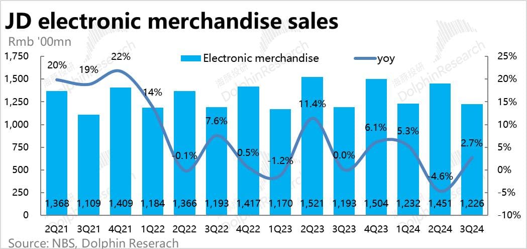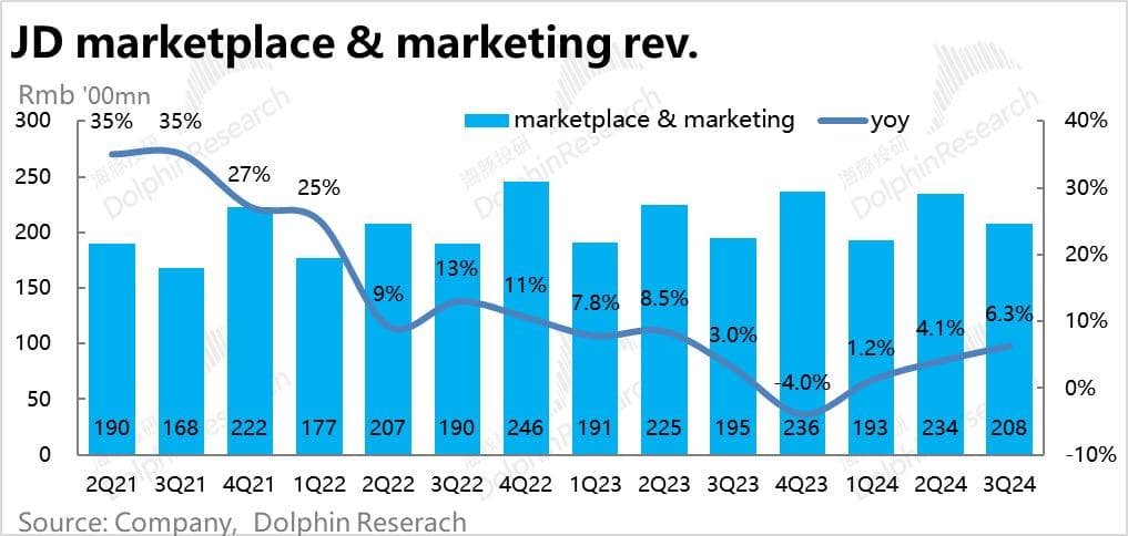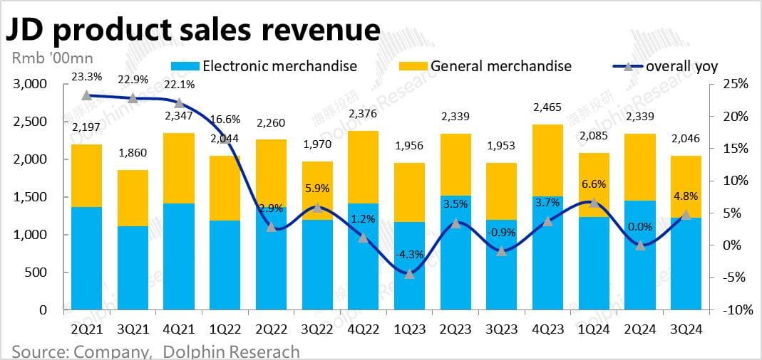 1、比重最大的自营零售业务本季收入2046亿元,同比增长4.8%,相比上季的同比零增,有显著的回暖。主要是归功于通电类产品的销售受益于家电换新的国补政策,收入增速从上季的同比下滑4.6%,明显回暖到了正增2.7%。一般商品的零售本季则保持约8%的较高增速,相比上季变化不大。